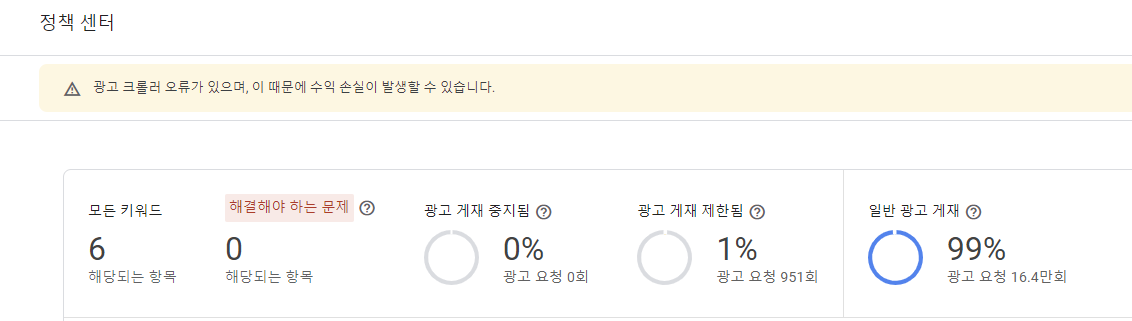 그동안 너무 거슬렸던 '광고 게재가 현재 제한적입니다' 메시지가 사라졌습니다. 그런데 사라졌던 크롤러 오류가 다시 생겼습니다.